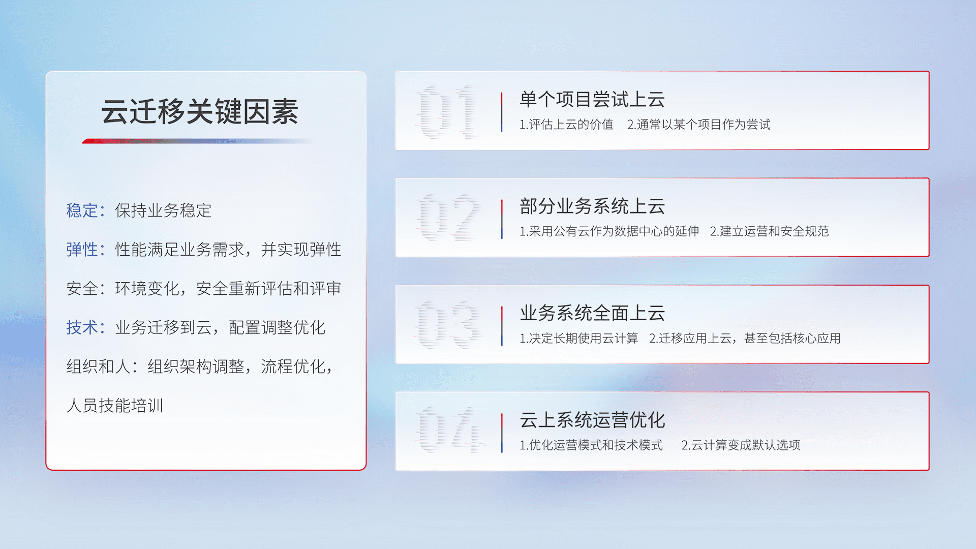 结合实际业务,,,,从规划设计、、云平台选型、、、、云原生改造、、、、数据迁移、、集成交付,,,,迁移全过程为客户识别最佳上云路径,,,,做好风险识别管理,,,设计网络架构、、身份权限、、安全审计合规、、、、操作审计、、、、日志审计、、、、监控告警策略、、多站点容灾设计等,,对云上基础设施进行整体规划,,,,提升IT治理水平,,,,以满足弹性、、高可用、、、、高性能的需求。。。