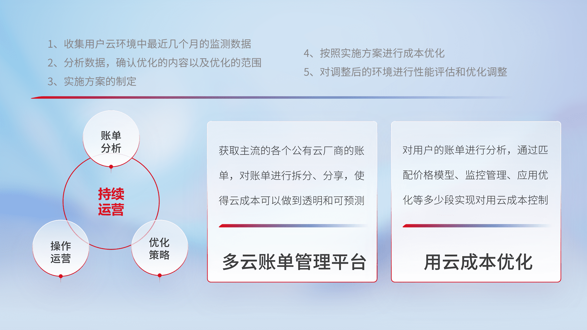 通过多云纳管,,,,以统一的资源数据模型把客户的云资源进行抽象和封装,,,进而实现对多云资源的统一操作,,,,保障云资源管理的可靠性、、稳定性与可用性。。。量身定制化运维内容,,,配置、、、、开发运维、、补丁管理、、、、备份、、、监控、、、、认证和访问管理、、、审计和日常巡检等,,,保障在用云过程中的可靠度,,,稳定度以及高可用率。。